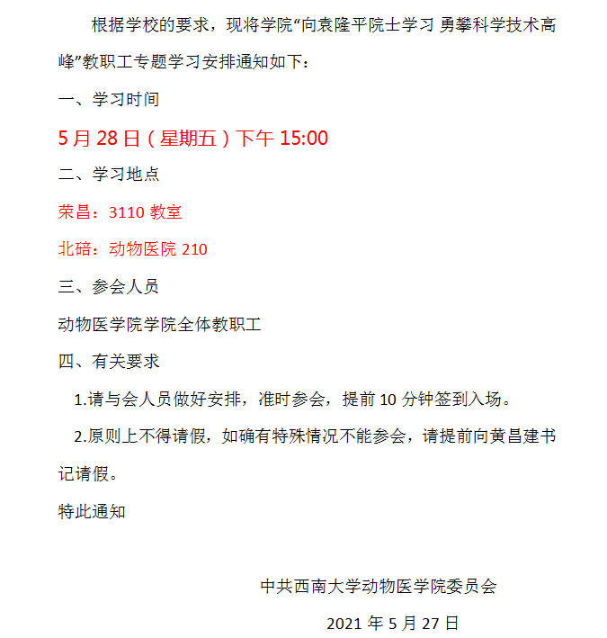 关于“向袁隆平院士学习 勇攀科学技术高峰”教职工专题学习通知