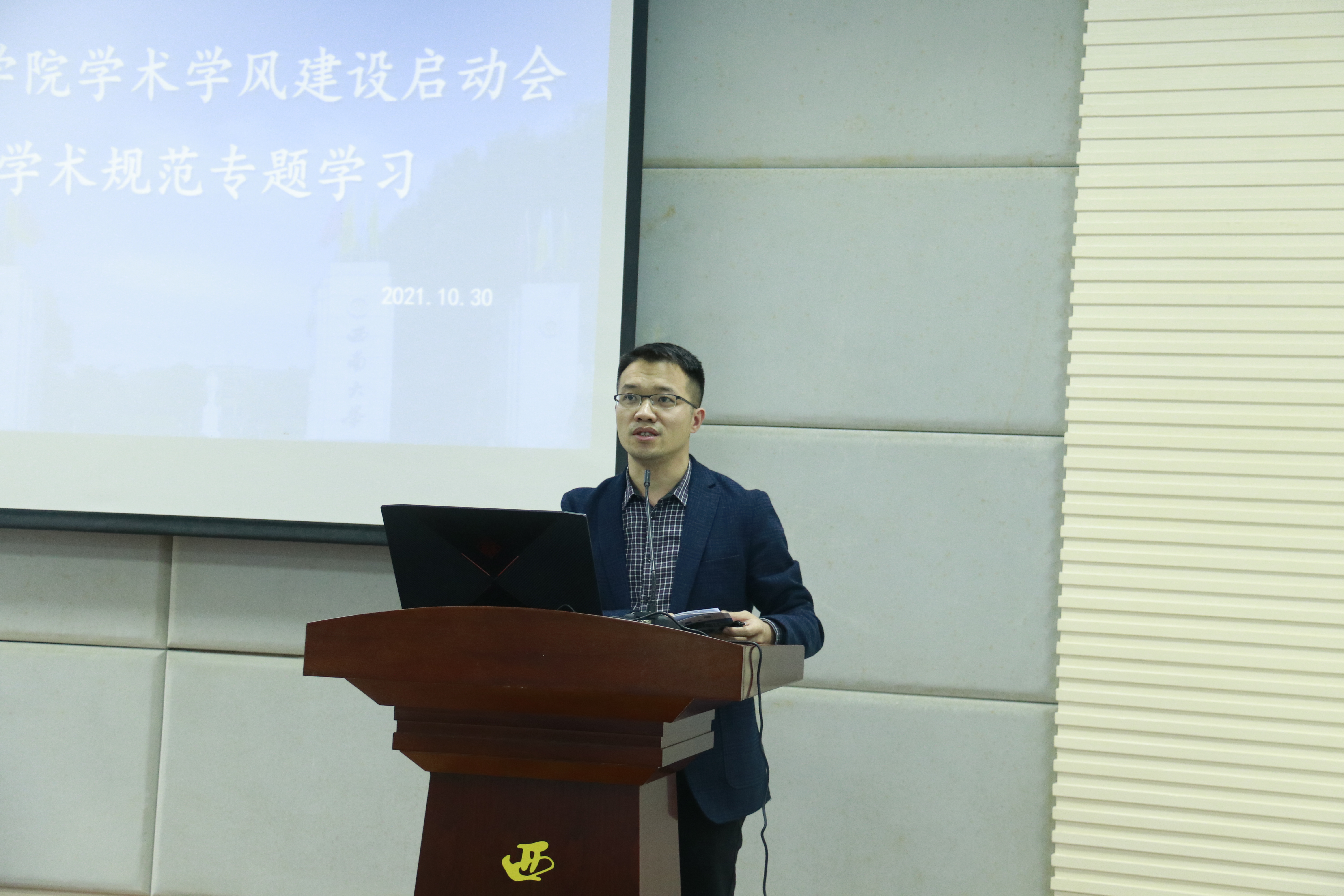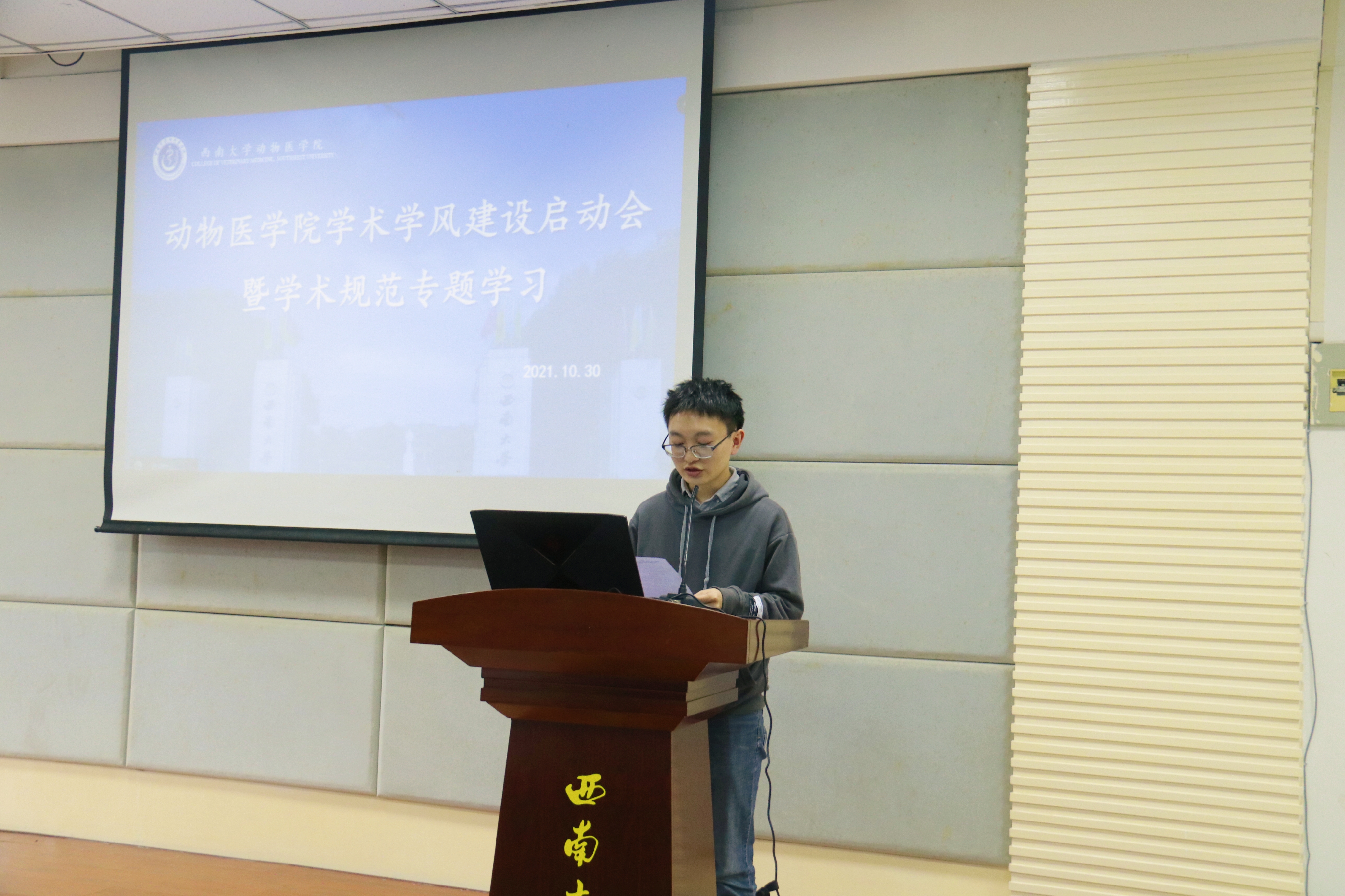 为推进研究生学术学风建设及研究生导师师德师风建设,根据研工部《关于开展2021年研究生学术学风建设系列活动的通知》要求,学院于2021年10月30日下午3点在北碚校区动物医院报告厅(线下)、荣昌校区3110报告厅(线上)顺利举行研究生学术学风建设活动启动会暨学术规范专题学习。学院党政领导、研究生导师及全体研究生参加会议。会议特邀第三军医大学庄园博士作关于《科学道德和学风建设》报告。会议由党委副书记、纪委书记黄庆洲主持。