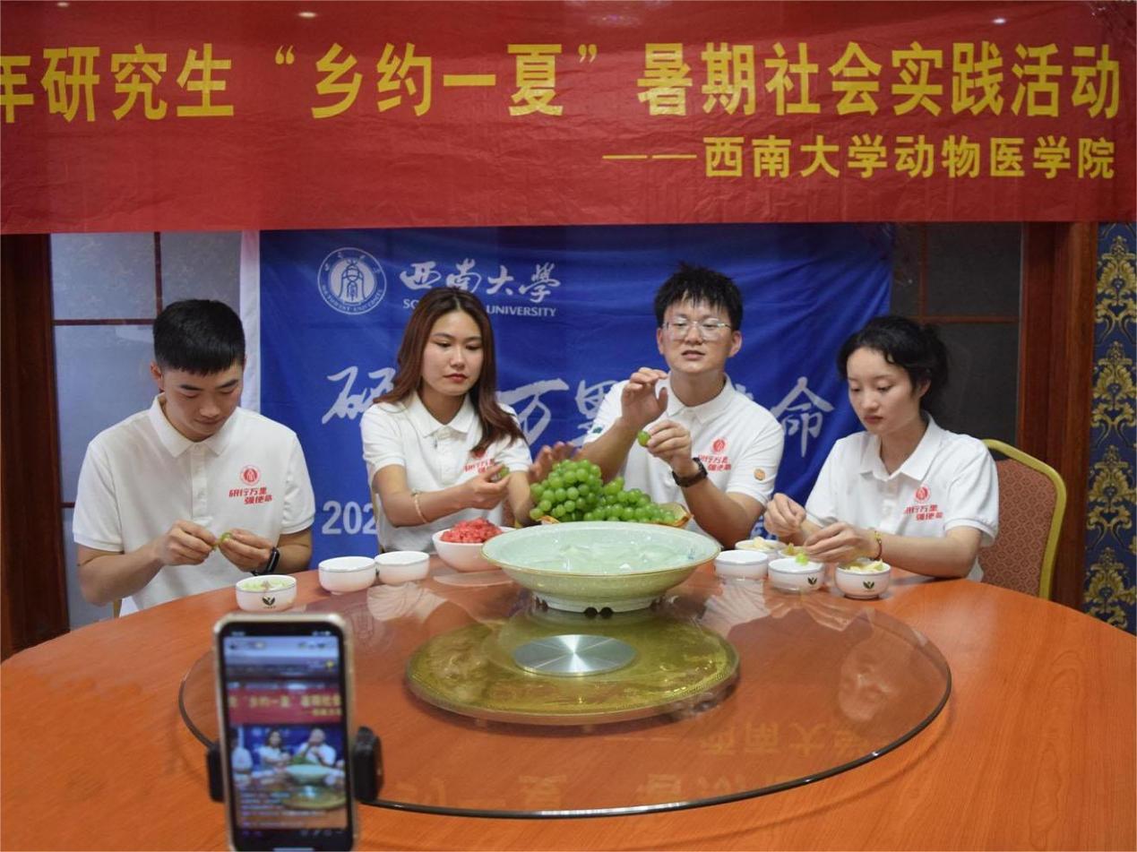“我们的农产品有了,但如何让农产品走向区外,打响长寿农产品的品牌,还是一个待解决的问题呢!”平伟农业的行政部部长张琳琳女士提出。为此,实践队以直播带货等线上平台宣传形式向大家介绍并推广了平伟农业特色农产品——“醉金香”葡萄。
