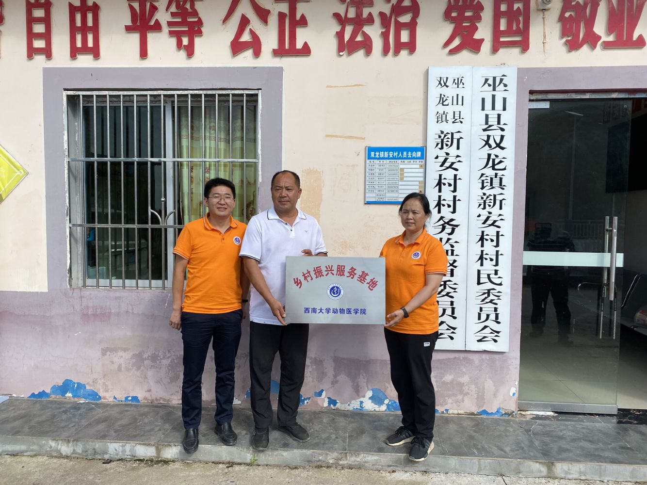 “乡村振兴服务基地”,院长刘娟、中兽医系主任曹立亭为其授牌,以此建立长效合作机制,进一步将学院人才优势资源、科技创新资源服务重心下移,将专业优势资源转化为服务地方乡村振兴的新动能。