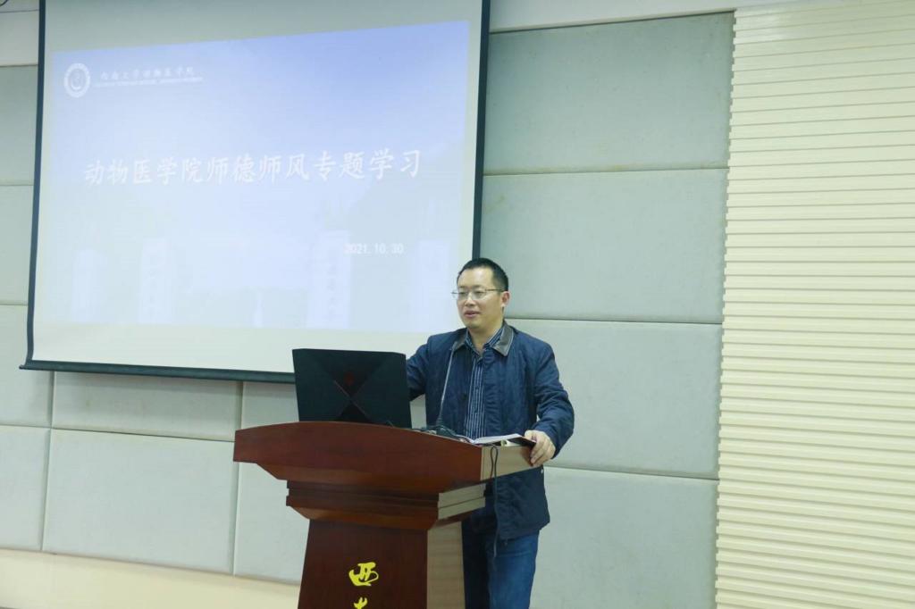为推进研究生学术学风建设及研究生导师师德师风建设,根据研工部《关于开展2021年研究生学术学风建设系列活动的通知》要求,学院于2021年10月30日下午3点在北碚校区动物医院报告厅(线下)、荣昌校区3110报告厅(线上)顺利举行研究生学术学风建设活动启动会暨学术规范专题学习。学院党政领导、研究生导师及全体研究生参加会议。会议特邀第三军医大学庄园博士作关于《科学道德和学风建设》报告。会议由党委副书记、纪委书记黄庆洲主持。