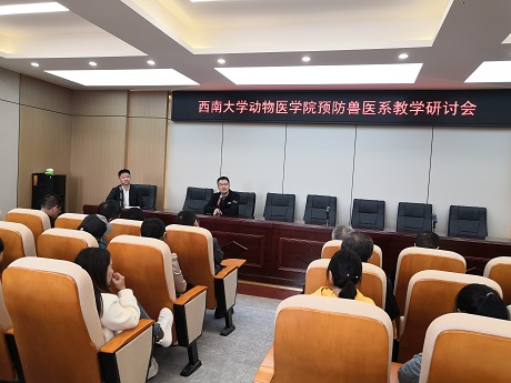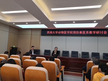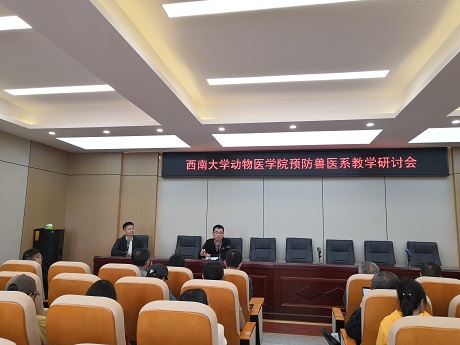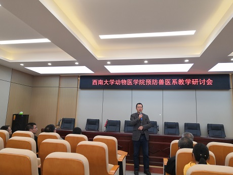 第三届“教研活动周”方案及开展教研活动的意义;刘娟院长就如何坚持“以本为本”,办好一流本科教育进行发言,提到本科教育重点在教学,呼吁站讲台的老师们要多读书,读好书,才能影响到学生们读好书,加强理论知识和技能的传授,培养“懂知识,有能力,能动手,能解决问题,让企业及社会认可“的学生;宋振辉副院长就本科课程建设的意义及当前我们课程建设中存在的问题进行了深入剖析;方仁东副院长也就科学研究在本科教学中的作用进行了阐释,退休老教师王豪举老师分享了其几十年的教学经验,指出实践对教学的重要性,希望青年教师能走到生产中去。随后,胡世君、李继祥、高继业等各位教师踊跃发言,对教学过程存在的问题进行了热烈讨论,国家动物医学类教指委员彭远义老师也从专业认证要求方面讲到课程体系建设要按照一流课程来设定,注重课程间的区分度,要加强老师与生产的紧密结合,同时加强科学研究并以此促进本科教学;校友罗仕伟兽医站站长代表基层对养殖技术需求进行了发言,基层需要接地气的专业技术,才能实际解决生产中的问题,希望老师们能在这方面进行相关探讨研究。最后,黄昌建书记进行了总结发言,提出教师要做好科学研究、社会服务与教学的紧密结合,做好课程建设紧密结合思政元素,以培养高能力、高素质学生为最终目标,鼓励老师多元化发展,突出自身优势,为更好的教书育人服务。