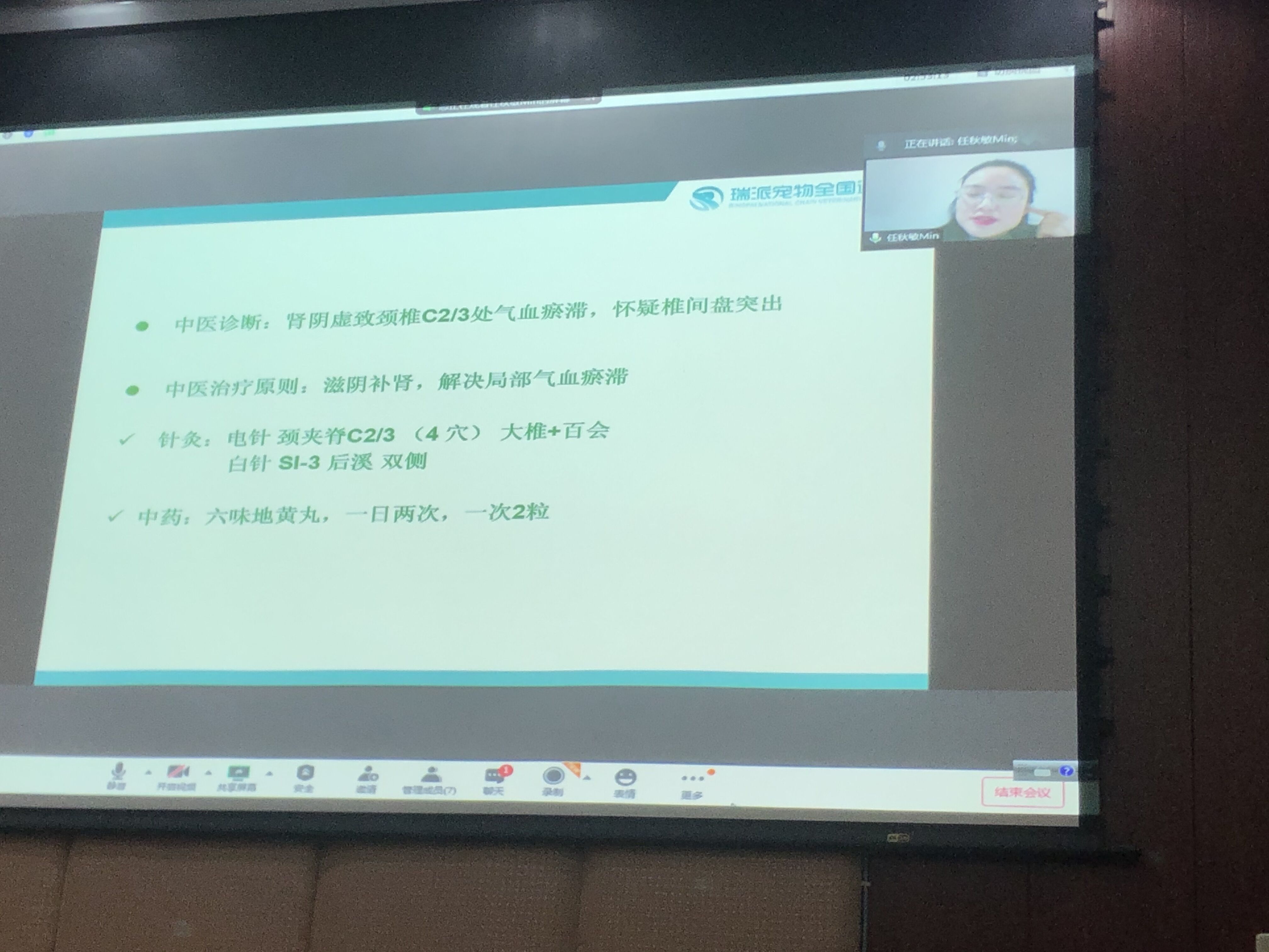 任秋敏医师首先介绍了中兽医的基本概念、国内外中兽医教育现状、国内外中兽医临床发展等几个方面;其次从个人学习和临床经验中总结了中兽医适应病症,如针灸对神经疾病的疗效,中药方剂对内科疾病的疗效;最后,分享了许多自己在临床遇到的采用中兽医治疗或中西结合治疗的病例。整个报告结构清晰,内容充实,针对性强。现场中兽医的同学反响强烈,表示该讲座不仅增加了他们对学习中兽医的信心和期望,还为他们未来的事业发展提供了宝贵的经验。