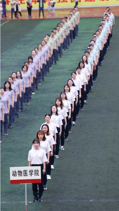 大旗,彰显出动医人勇于开拓、自强不息的精神风貌;写有“同一个世界 同一个健康”的横幅展现了动医人至诚至信、守护生命健康的担当。