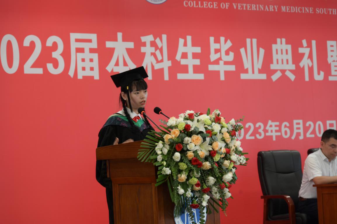 在荣重庆市优秀毕业生符雪珍作为毕业生代表发言,她回顾了在学校奋战学术竞赛、潜心探索科研的四年美好的大学时光,并表示将秉持“含弘光大 继往开来”的校训,牢记“厚德博学 笃行致新”的院训,追求卓越,勇闯未来;同时表达了对学校和学院的感激之情,愿大展宏图,再谱华章;表达了对同学的美好祝福,愿风雪灿烂,前程似锦。