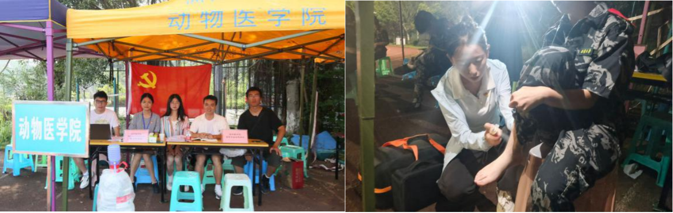 在23级同学们训练的过程中,学院在运动场设立了团委学生会和党员服务站,服务站随时有人在勤,学长学姐们将饮用水和药品准备充分,帮助身体不适的同学做修复,处理伤口......
