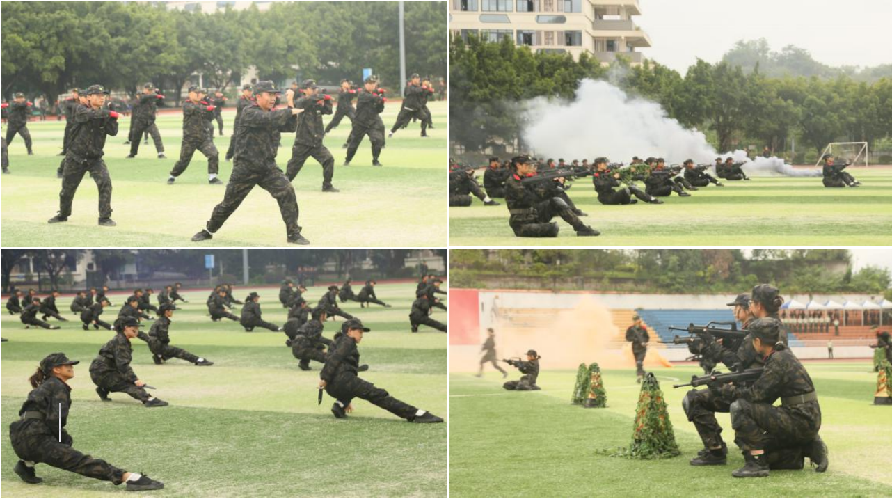 十四天里,新生们首先进行了共同条令、单兵及分队队列动作的训练,随后分配至不同方阵进行分列式、拳术、匕首操、警棍术、心理健康操、单兵及班排进攻战术各项目的训练。
