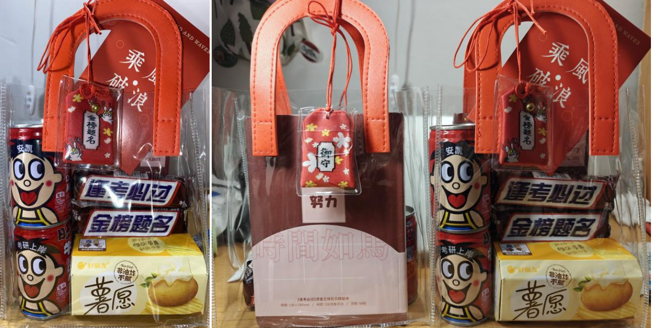 大礼包由学院为2024届考研学子们精心定制,美味与心意并存。礼包里有一罐刻着考研学子姓名,另一罐刻着“考研上岸”的旺仔牛奶,寓意着“金榜题名,逢考必过”的士力架,收获成功的薯愿薯片,写满祝福的逢考必过笔记本,携挂着“金榜题名”祝福锦囊,还有承载着学院暖心鼓励的手写考研寄语卡片。收到礼包的同学们纷纷表示切实体会到了学院的温暖,他们一定不会辜负老师们的期望,在最后阶段努力冲刺,力争取得好成绩。