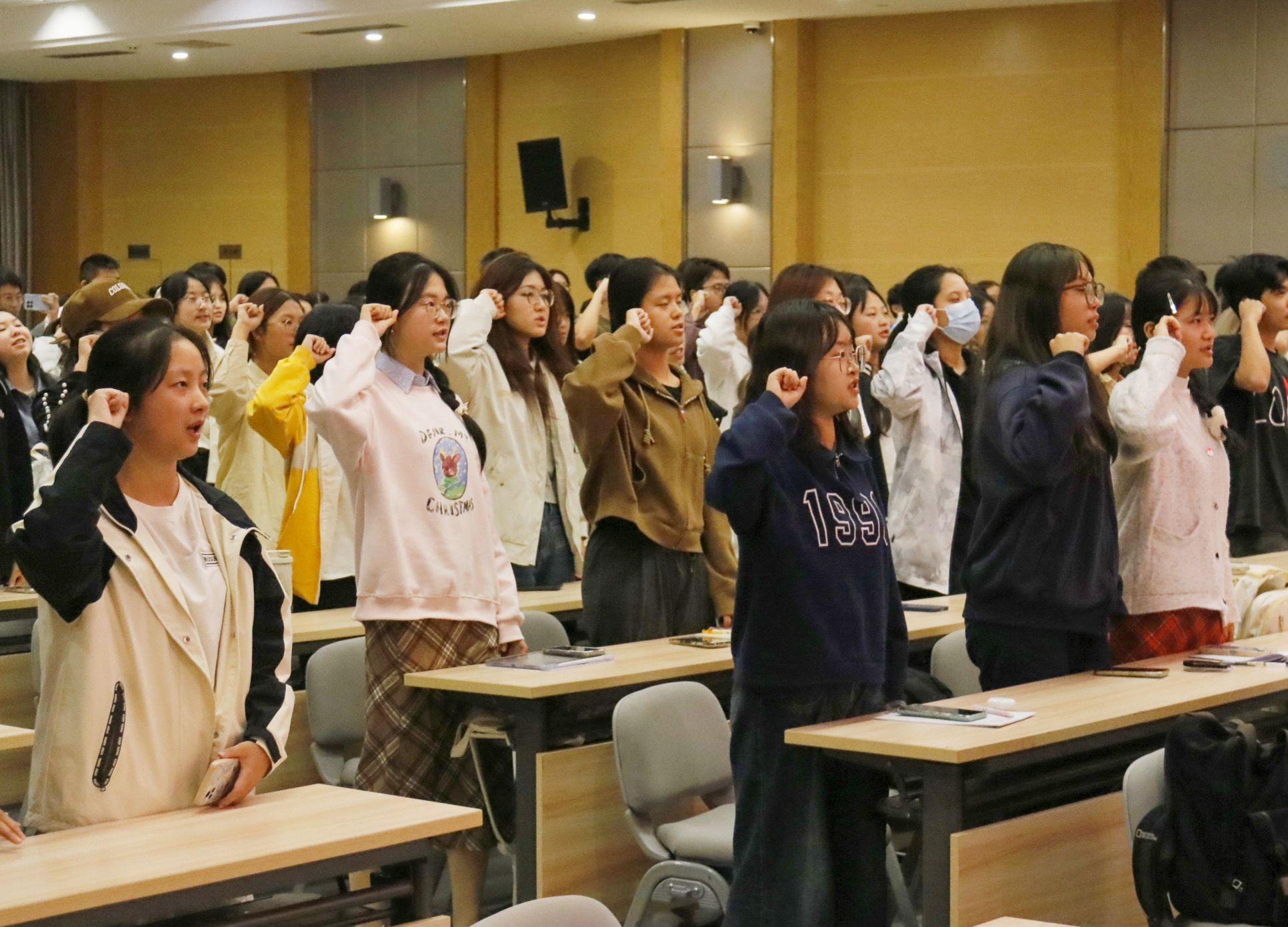 问答结束后,所有同学起立,由学习部部长李萌萌带领大家进行励志宣誓。“我将以知恩感恩之心明修养、以勤奋努力之姿向学习、以创新卓越之思迎挑战!”激昂慷慨的声音在大厅飞舞,每个同学都目光坚定、斗志昂扬,对学习、对生活、对未来都有了更加明确的方向!