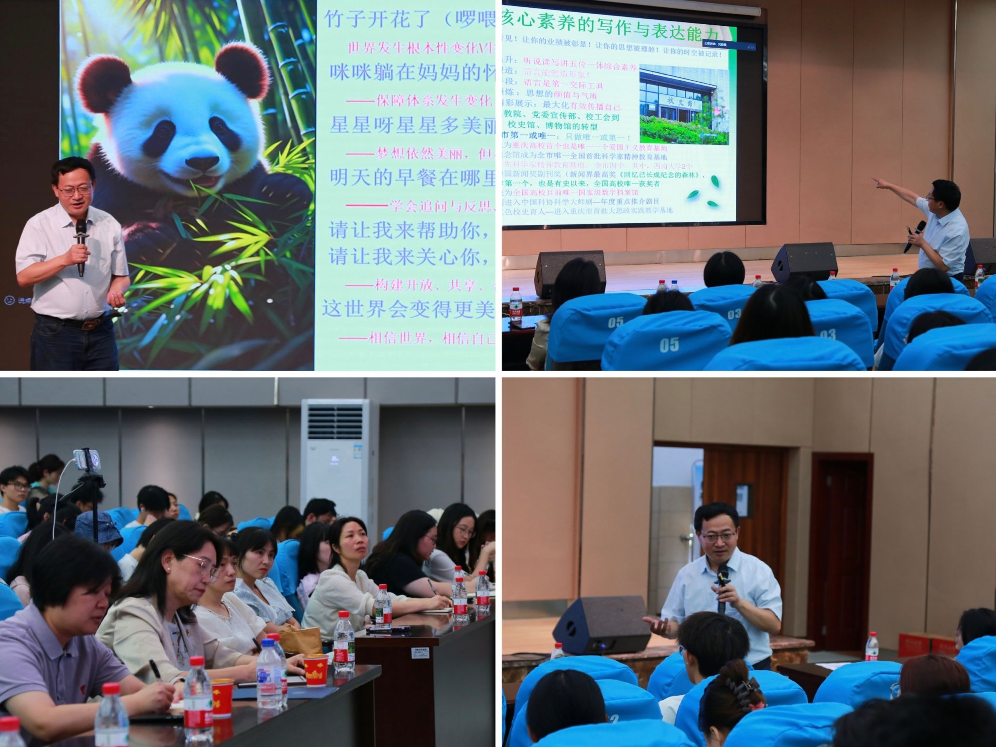 讲座伊始,郑教授以一首拯救大熊猫的公益歌曲作为独特引子,其声情并茂地演绎,瞬间吸引了全场师生的关注。随后,他结合自身求职经历,深入剖析了写作与表达的“核心四要素”,并通过真实面试案例,系统拆解求职沟通的五大实用技巧,揭示了求职沟通与精准表达的底层逻辑。