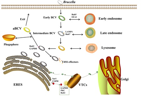 布鲁氏菌通过在靶细胞(巨噬细胞、树突状细胞和滋养层细胞)内复制引起宿主发病,这一过程依赖于VirB操纵子编码的四型分泌系统(T4SS)。