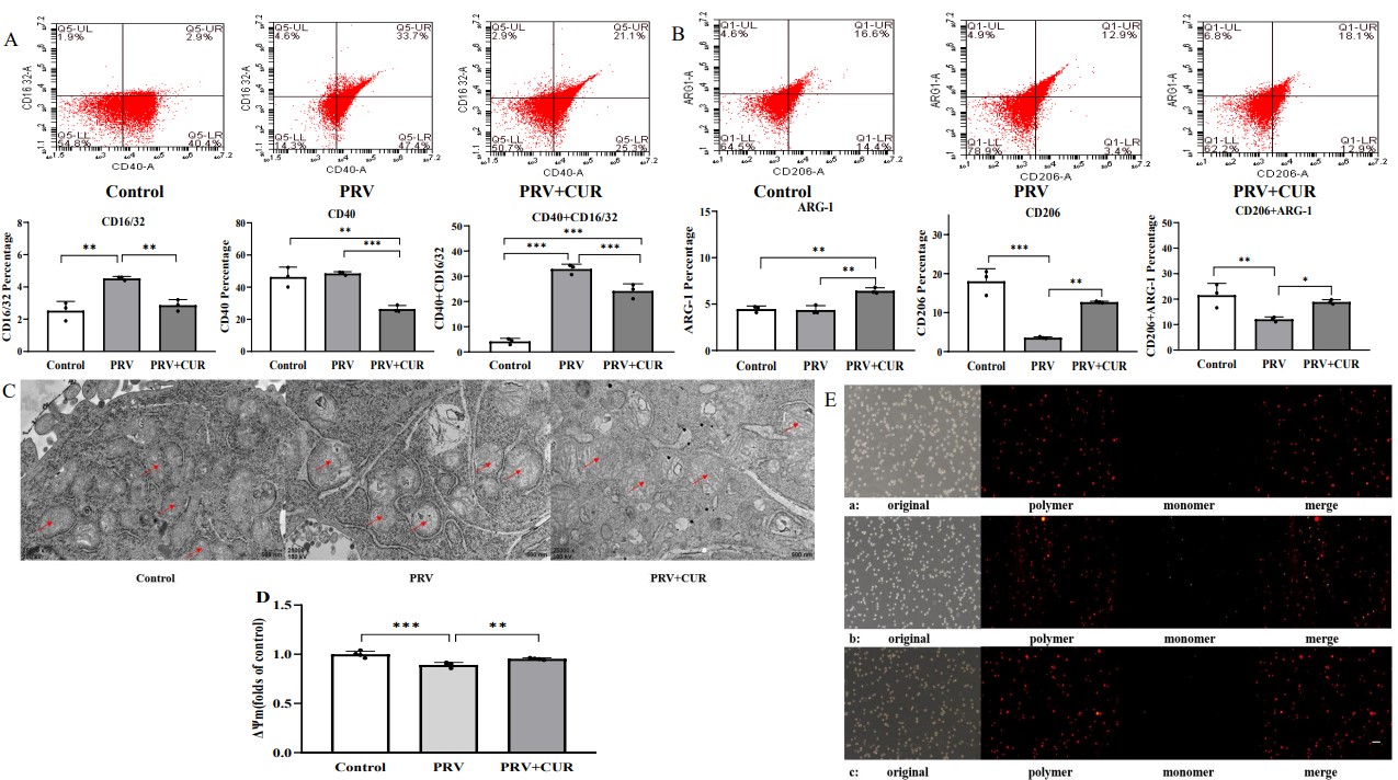 图CUR促进PRV感染BV2细胞从M1表型向M2表型的极化,并逆转PRV感染导致的线粒体功能障碍